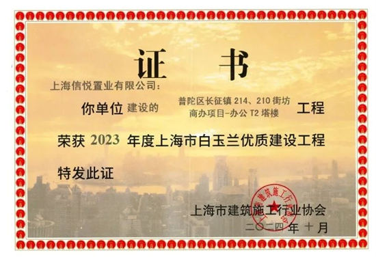 2024年12月,上海市建筑施工行业协会授予上海信泰中心T2办公塔楼——上海市“白玉兰”优质建设工程荣誉证书及奖杯。